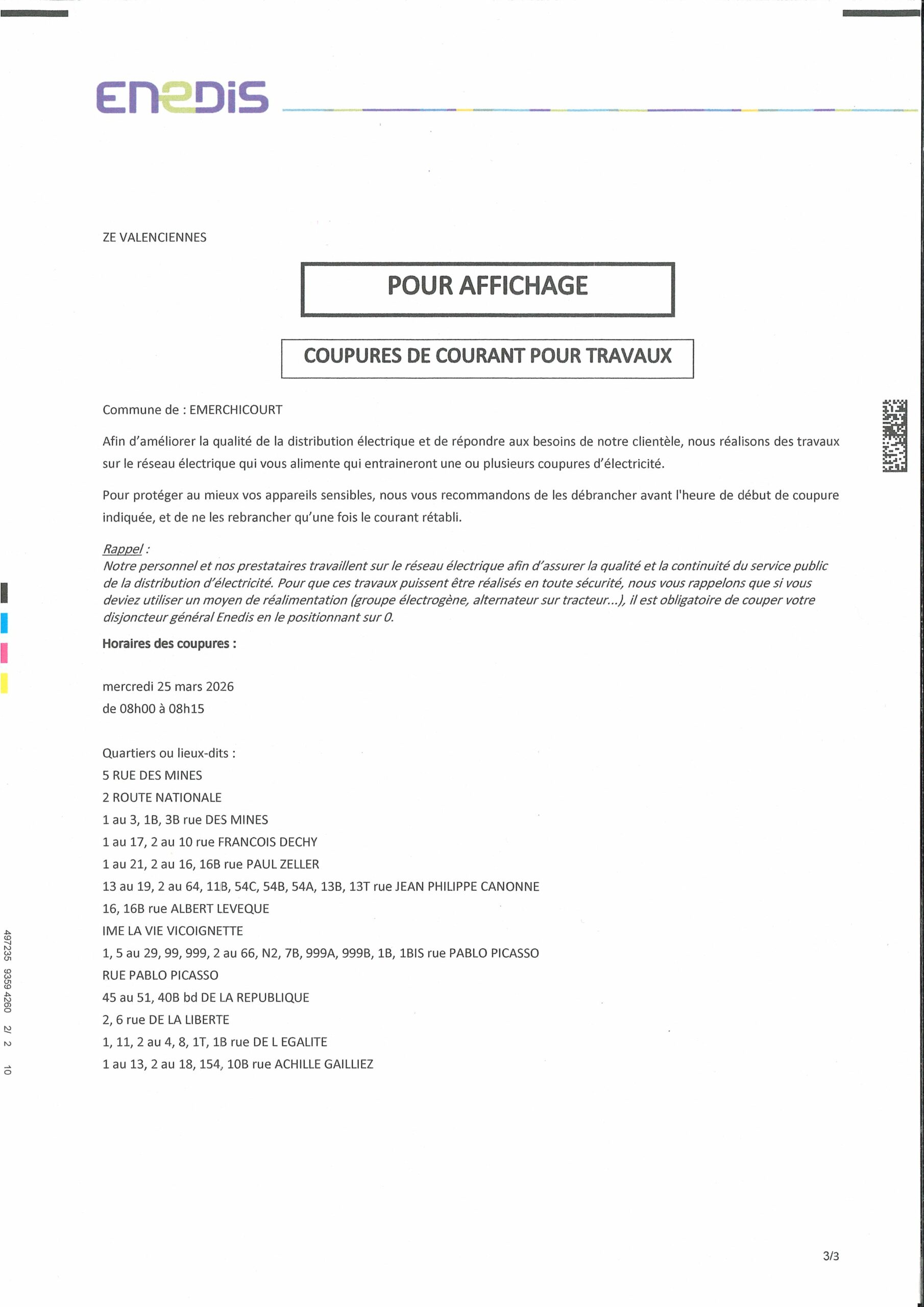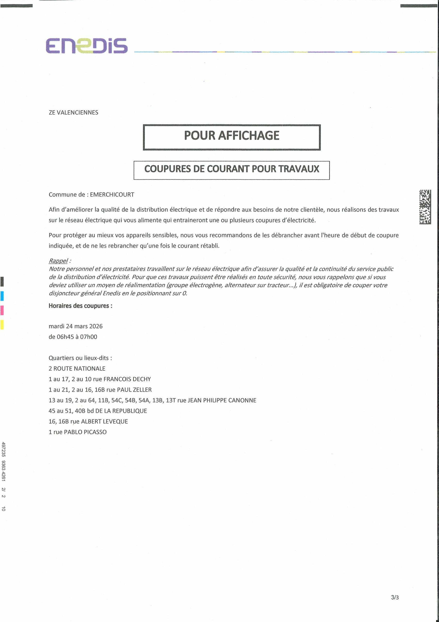 COUPURES DE COURANT POUR TRAVAUX 24 ET 25 MARS 2026