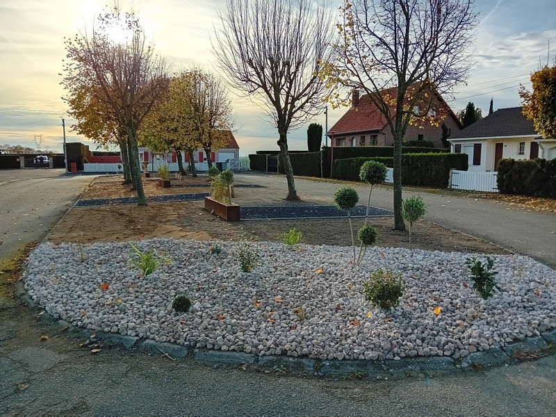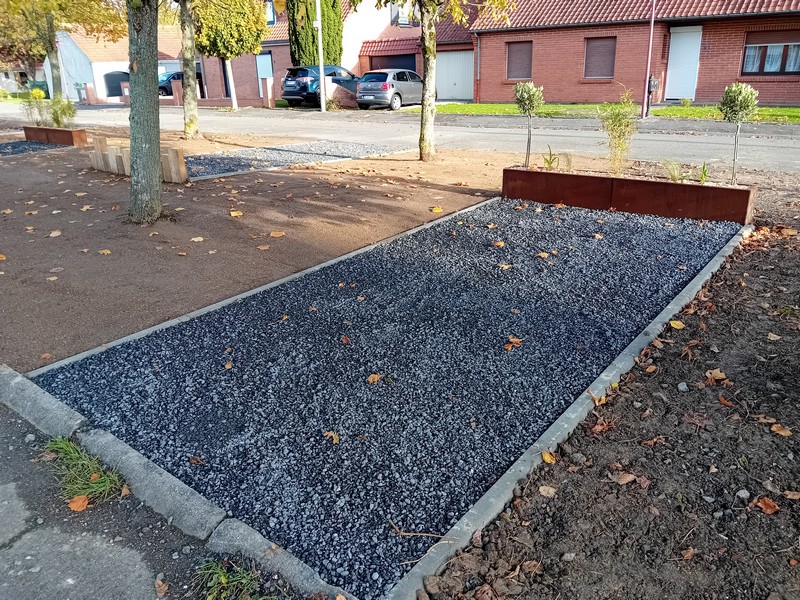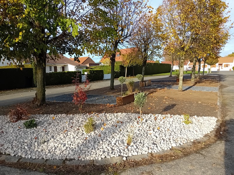 Suite aux précédents aménagements d’espaces publics du village, c’est la placette de la rue François Dechy qui a fait peau neuve. Dans un espace déjà arboré, cinq places de parking pour véhicules légers, délimités par des jardinières ou des traverses en chêne ont été créées. Aux extrémités, des massifs ont été plantés pour végétaliser cet espace engazonné qui révélera différentes couleurs au printemps grâce aux bulbes cachés.